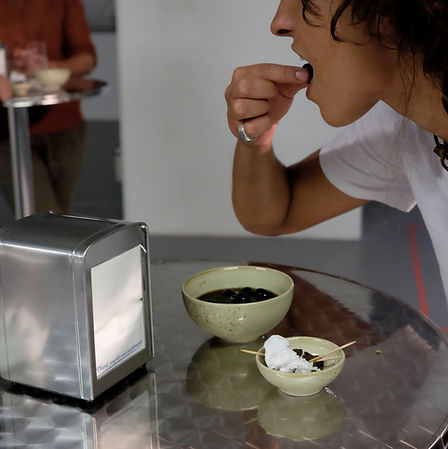 Building on this, the installation features five dispensers styled after these classic designs, offering napkin imitations that bear the phrase "Thank you for your performance" in the same typographic font. These dispensers will be casually arranged on a metal counter and at the gallery's bar, seamlessly blending into the space as if they were part of a catering service provided by the institution. Beside the dispensers, bowls filled with olives will be placed, inviting visitors to partake. As they enjoy the olives and inevitably need to use the napkins to clean their hands or dispose of the pits, the blue-printed phrase will subtly remind them that their simple action has transformed them into active participants in the performance.
